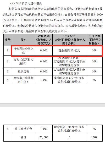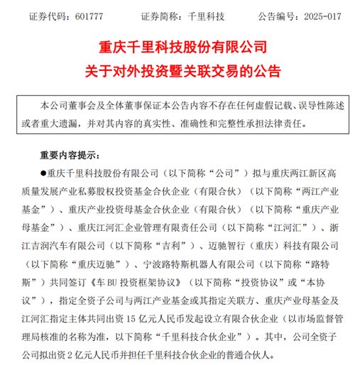 来源:千里科技公告据悉,重庆千里智驾有限公司由浙江吉润汽车有限公司或其指定主体、迈驰智行(重庆)科技有限公司、路特斯或其指定主体,以及员工激励平台共同投资设立,并且获得各方股东注入智能驾驶相关研发技术、数据、人员等优质资源。千里科技公告称,通过本次协同合作,重庆千里智驾有限公司将整合各方在智能驾驶技术、研发资源、资金及产业资源等方面的优势,发挥更大的协同效应,提升研发效率并降低研发成本,进而加速形成智能驾驶技术的产业领先优势。同时,本次投资符合千里科技的“AI+车”战略发展方向。千里科技公告称,公司本次投资对探索以AI为驱动的科技智能化,以及深化智能驾驶和智能座舱布局具有重要战略意义。2月21日,吉利汽车、千里科技和“大模型六小虎”之一的阶跃星辰联合宣布,将推动“AI+车”的深度融合。彼时,印奇在现场称,“AI+”将在大模型时代孵化新的应用,而“AI+车”会是第一个落地场景,最重要的是智能驾驶和智能座舱。这正是千里科技未来的核心战略方向。拟合作方涉及地方国资、车企、AI公司公告显示,千里科技此次计划的合作方,包含地方国资、车企和AI公司。两江产业基金、重庆产业母基金均是重庆国资旗下投资平台;浙江吉润汽车有限公司、路特斯均是吉利控股集团旗下公司。官网显示,路特斯致力于打造最佳智能驾驶实践平台,并以“全面赋能机器人的时代”作为使命。迈驰智行(重庆)科技有限公司、江河汇的股东,分别包含旷视科技旗下公司、旷视科技实控人印奇。