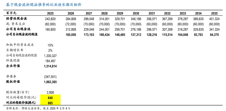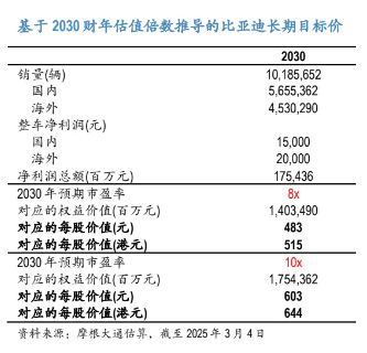 我们基于各种假设评估了比亚迪股价的长期上行空间。我们的分析显示,比亚迪的长期股价可能在515-685 港元股之间,但会受到市场情绪和风险偏好的影响。我们基于长期目标价区间(约515-685港元)的中值,得到截至26年6月的目标价为600港元。我们的目标价对应1.7/15倍的2025/2026年预期市销率。隐含目标市值约为 1.744万亿港元/2.230亿美元,而丰田截至2025年2月19日的市值为2.870亿美元。