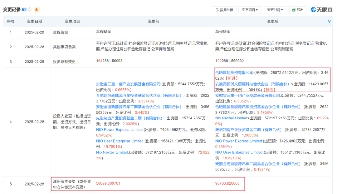 2月28日,蔚来控股有限公司新增了几条商业信息变更。其注册资本从5.7亿增至9.07亿,新增了4个亿。公司总投资额也从164亿,变成了192亿,这意味着蔚来可能通过股份增发,获得了28亿融资。