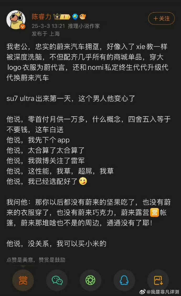 最近有网友分享,自己的老公是蔚来的忠实拥趸,和nomi私定终生代代升级代代换蔚来汽车。但小米SU7 Ultra上市的第一天,他就变心转投了小米。