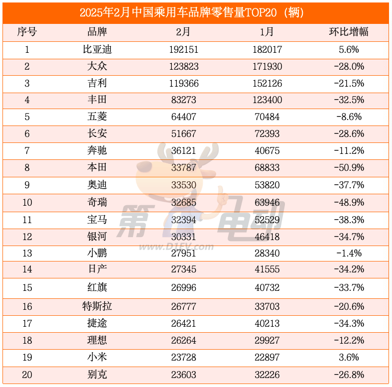 随着智驾版车型的上市,比亚迪2月销量环比上涨5.6%达19万辆,稳居中国乘用车品牌榜榜首。凭借一款su7,小米销量稳步提升,2月销量达2.4万辆,环比上涨3.6%,首次上榜位居第19。