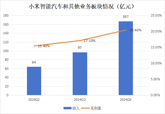 回到小米汽车的业绩上看,根据财报,2024年全年,小米智能汽车和其他业务收入达到328亿元,其中智能汽车收入321亿元,已经可以和全年汽车销售收入358亿元的小鹏相提并论了;Q4,小米汽车收入达到163亿元,经调整净亏损是7亿元。