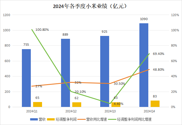 首先,小米已经彻底印证了自己实现超额增长的能力。一个印证标志性的指标,是经调整净利润的增速远超营收,且均能实现高两位数增长,除了比较特殊的2024年Q1(2023年Q1因为刚放开,基数实在太低)实现了经调整净利润增速达到100%之外,Q4创下了过去一年小米营收和经调整净利润的增长纪录。