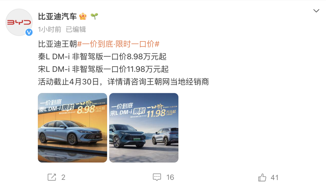 3月29日,比亚迪汽车微博发布信息,宣布针对王朝网部分车型非智驾版本推出限时一口价活动。其中,秦L DM-i非智驾版起售价官降1万元至8.98万元,宋L DM-i非智驾版起售价官降1.6万元至11.98万元,活动截止日期为4月30日。