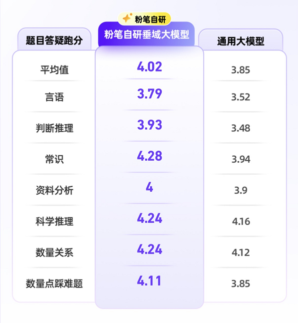 早在2024年6月,粉笔自研垂域大模型通过第六批深度合成服务算法备案,成为首批通过国家备案的职教行业大模型。2025年3月,粉笔垂域大模型PRO深度融合推理能力,全新升级。内部测评数据显示,在题目答疑场景,粉笔自研垂域大模型在言语、判断推理、常识、资料分析等科目中的跑分表现均优于市面上的通用大模型。