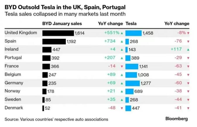 在更加发达的欧盟市场,仅在今年1月份,比亚迪在英国、西班牙及葡萄牙这三个欧洲国家的销量同比增幅惊人,分别达到了551%、734%和207%。形成对比的是,同期特斯拉在上述三国的销量则分别录得8%、76%和29%的跌幅。
