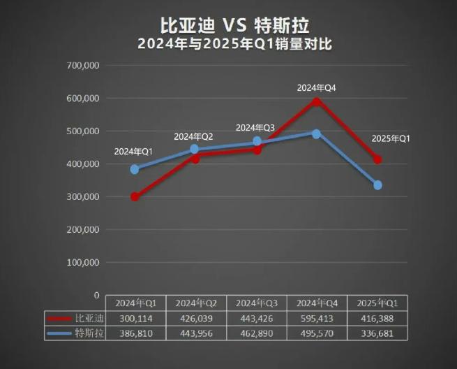 值得注意的是,这是继2024年第四季度首次超越特斯拉之后,比亚迪连续第二个季度在纯电动汽车销量上领先对手。相较之下,特斯拉在2025年第一季度的销量为33.67万辆,同比下滑了13%。