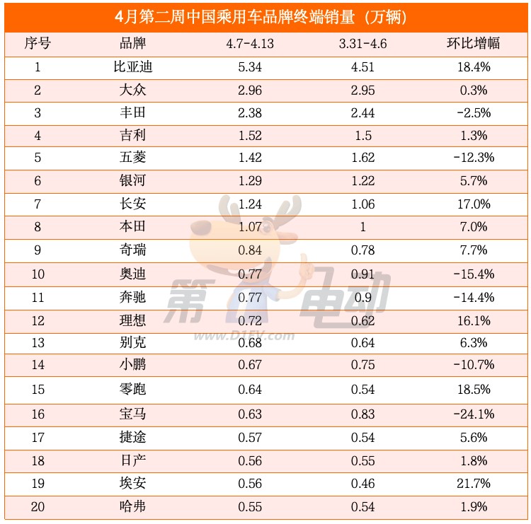 4月第二周(4.7-4.13),中国乘用车总量35.1万辆,环比增长3.94%,新能源车销量18.6万辆,环比增长10.1%,新能源车渗透率达53%,相比4月第一周提升3个百分点。