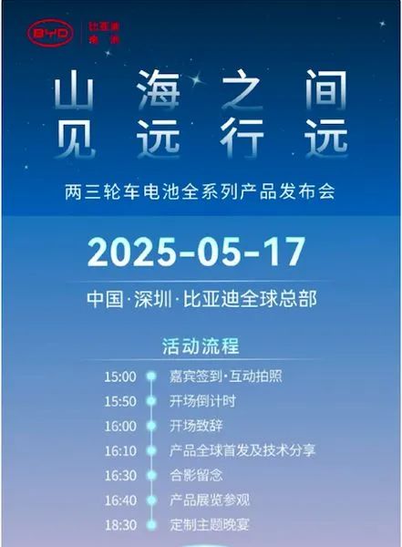 近日,据相关媒体报道,比亚迪将于5月17日举办电动两轮、三轮电池全球上市发布会。