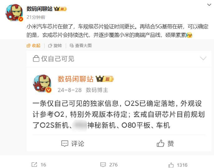 而知名数码博主@数码闲聊站也发文暴露,小米玄戒自研芯片落到车机上早在2024年8月就已经纳入计划内。