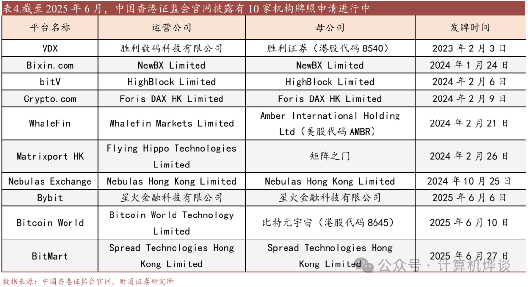虚拟资产交易所:Coinbase、Robinhood、OSL集团、富途控股、老虎证券、国泰君安国际、胜利证券、国富量子、天风证券等。