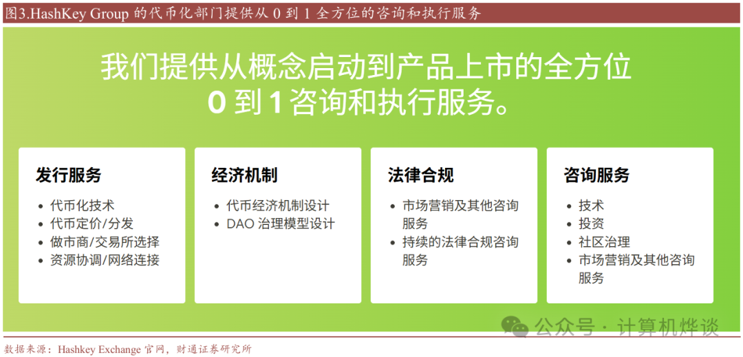HashKey Group提供RWA等代币化全链路解决方案,落地博时、太保、广发证券多款代币化产品。产品代币化环节,HashKey Tokenisation 为产品提供代币化发行全流程设计以及执行;RWA上链环节,部署于金融机构和 RWA 资产首选公链 HashKey Chain,并依托 HashKey 的 NexaToken 服务实现链上资产安全管理。RWA交易环节,由中国香港最大持牌虚拟资产交易平台 HashKey Exchange 作为主分销渠道,将通过即将推出的理财频道提供分销及托管服务。