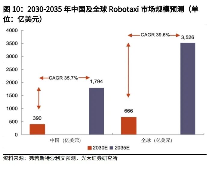 Robotaxi 市场规模快速增长,中国 Robotaxi 仍有较大渗透空间。弗若斯特沙 利文研究显示,Robotaxi 市场将快速增长,预计 2030 年全球市场规模达 666 亿美元,中国市场规模达 390 亿美元;2035 年全球市场规模达 3,526 亿美元, 中国市场规模达 1,794 亿美元,占全球 50.9%,2030-2035 年五年 CAGR 分别 为 39.6%、 35.7%。当前中国 Robotaxi 渗透率仍较低,量子位智库预测 2025 年订单渗透率仅占网约车总量(109 亿单)的 0.36%。技术迭代、政策开放与商 业模式革新正驱动行业进入高速成长期。量子位智库预测中国 Robotaxi 订单 量于 2030 年将大幅增长至 85.59 亿单,渗透率达 49.8%,占据网约车市场近 一半份额。