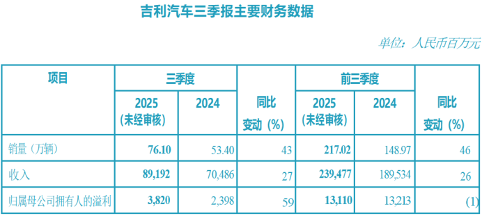 11月17日,吉利汽车(0175.HK)发布2025年三季度财报。