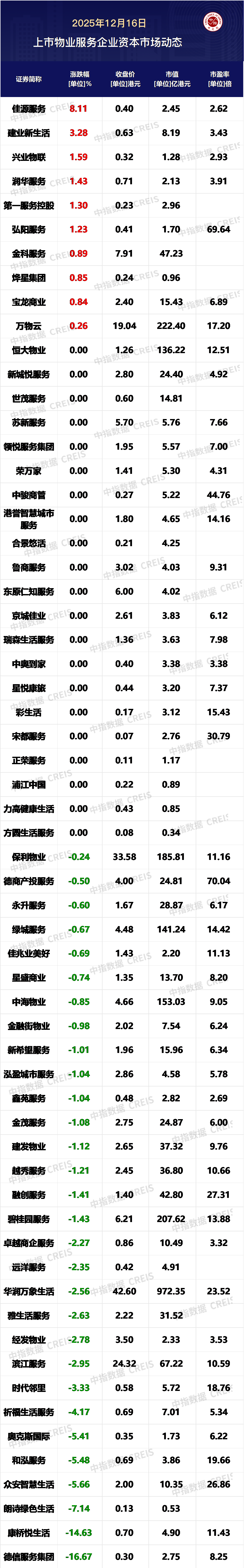 12月16日,恒生指数,收盘下跌393.47点,跌幅约为1.54%,报收25235.41点。今日61家港股上市物业服务企业中10家上涨。佳源服务涨幅为8.11%,位列今日港股物业服务板块第一位。