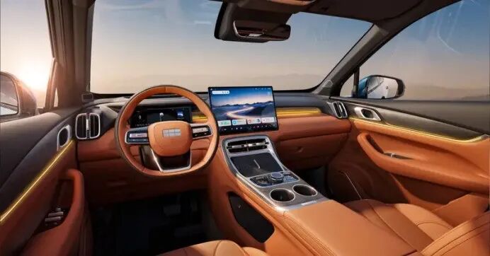 外观设计上,银河M7延续M9的元素,融入“飞檐”“虎视”等中国古典美学元素,塑造出从容大气的豪华气质。内饰方面,以“宽景广厦”为设计理念,通过压缩仪表台厚度、优化A柱角度,为驾驶者提供开阔通透的视野。车内采用大面积生态麂皮包覆,搭配自然木纹饰板点缀,营造出温馨舒适的乘坐氛围。