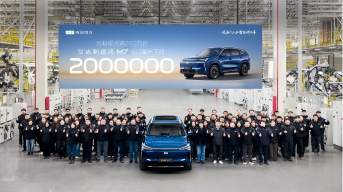 吉利银河第200万辆量产车——银河M7在杭州智能制造基地下线。
