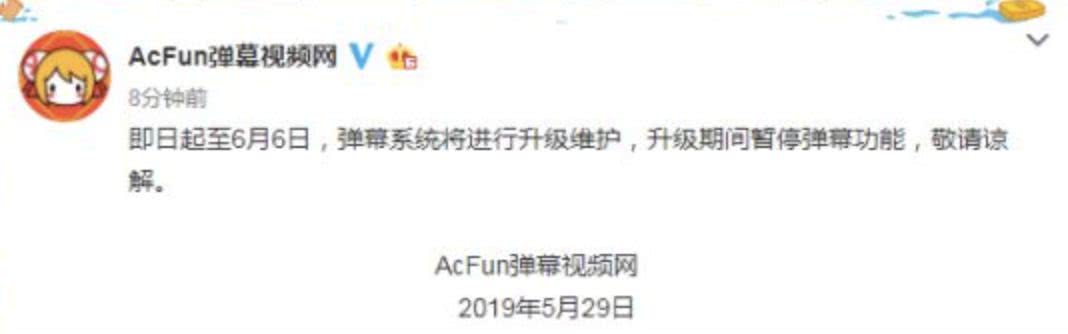 根据B站5月29日晚间的公告,“因弹幕系统技术升级,从即日起至6月6日网站将暂时关闭弹幕功能”。紧接着A站发布类似公告:“即日起至6月6日,弹幕系统将进行升级维护,升级期间暂停弹幕功能。”