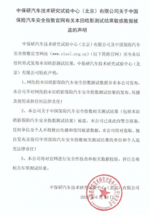 眼看要酿成公关危机,中保研于20日将原本可通过修改进入的链接页面关闭,并在21日发布声明,一方面表示,皓影测试结果敏感数据被盗,另一方面,否认曾以任何方式发布过本田皓影测试结果,网传数据并非由其发布。据称,公司已向警方报案。也就是说,网传数据可能为“被盗数据”,但并非由其发布。