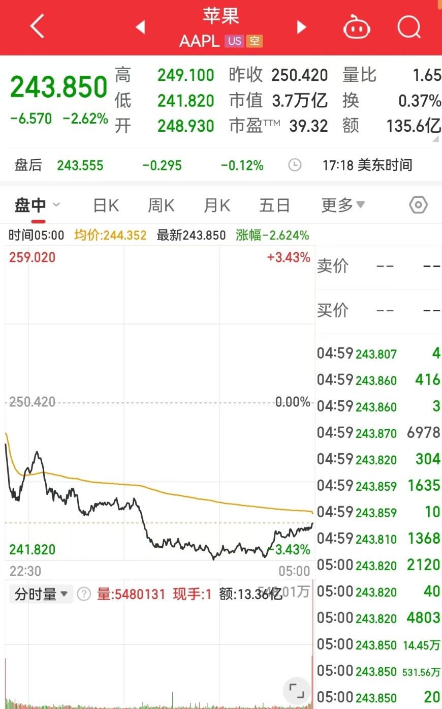 苹果报243.85美元,跌2.62%,创去年10月份以来最大单日跌幅。其市值一夜蒸发993亿美元(约合人民币7248亿元)。