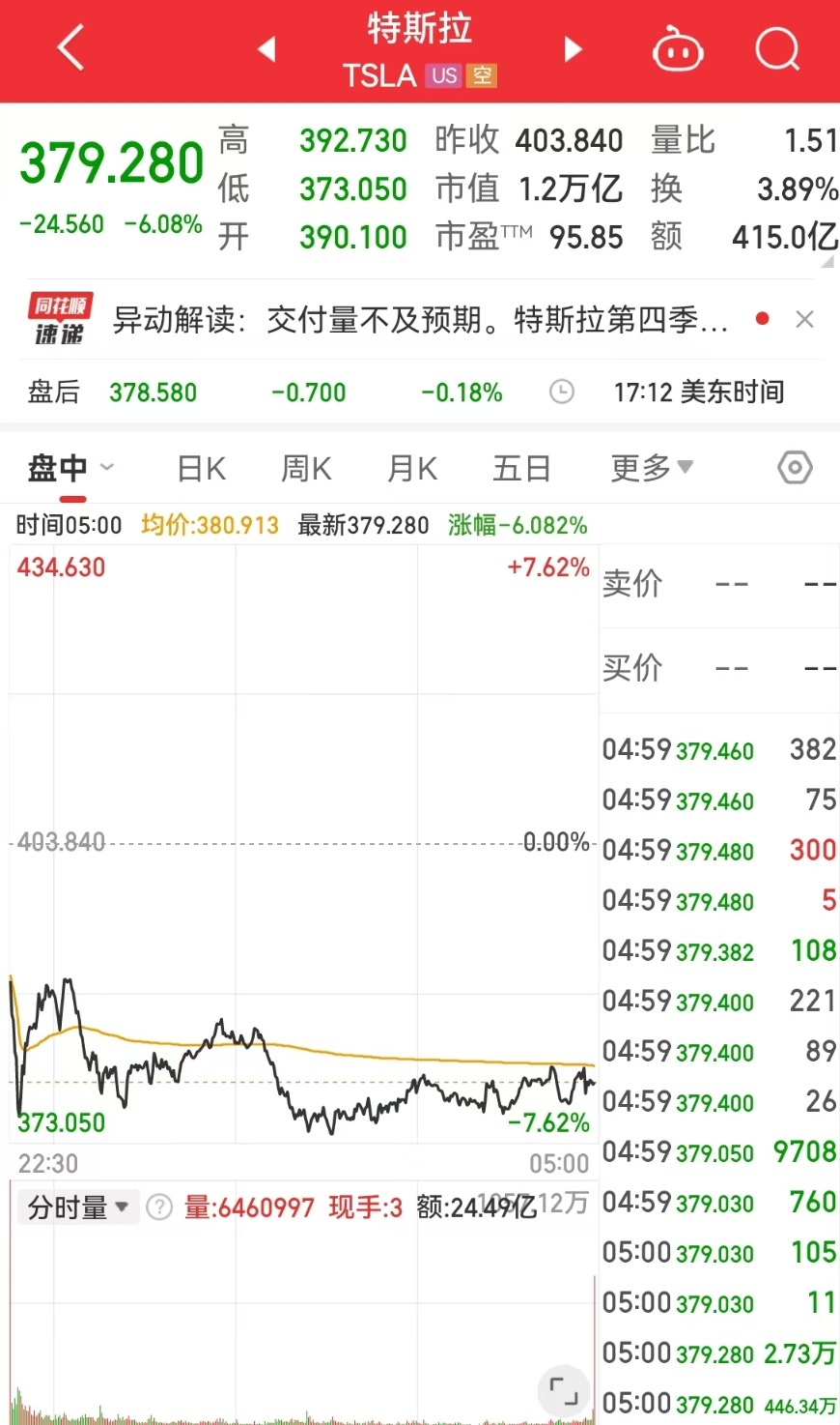特斯拉报379.28美元,跌6.08%,市值一夜蒸发788亿美元(约合人民币5752亿元)。