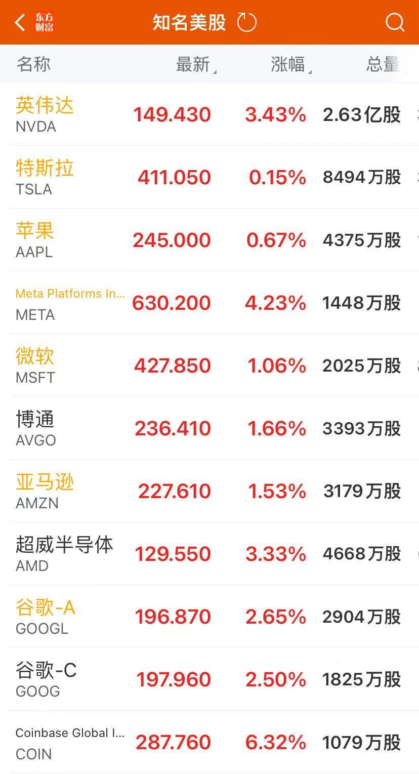 美股“七姐妹”中,Meta Platforms收涨4.23%,英伟达涨3.43%,报149.43美元,突破2024年11月7日所创收盘历史最高位148.87美元;谷歌A涨2.65%,亚马逊涨1.53%,微软涨1.06%,苹果涨0.67%。