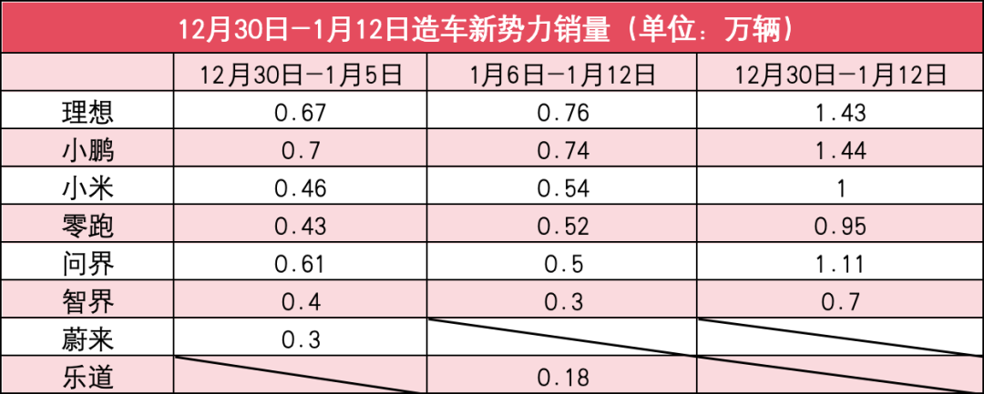 从前两周的整体表现来看,在年底冲刺过后,各家的销量都出现了不同程度的下滑,没有一家周销量过万辆。其中,理想和小鹏保持在0.7万辆左右,其余几家新势力则基本上都在0.5万辆及以下。这也是意料之中的事情。