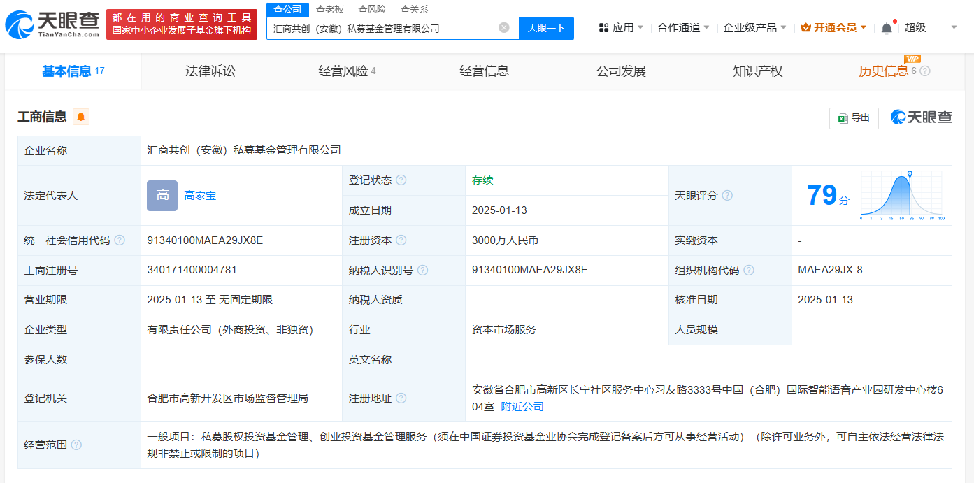天眼查App显示,近日,汇商共创(安徽)私募基金管理有限公司成立,法定代表人为高家宝,注册资本3000万人民币,经营范围包括私募股权投资基金管理、创业投资基金管理服务。