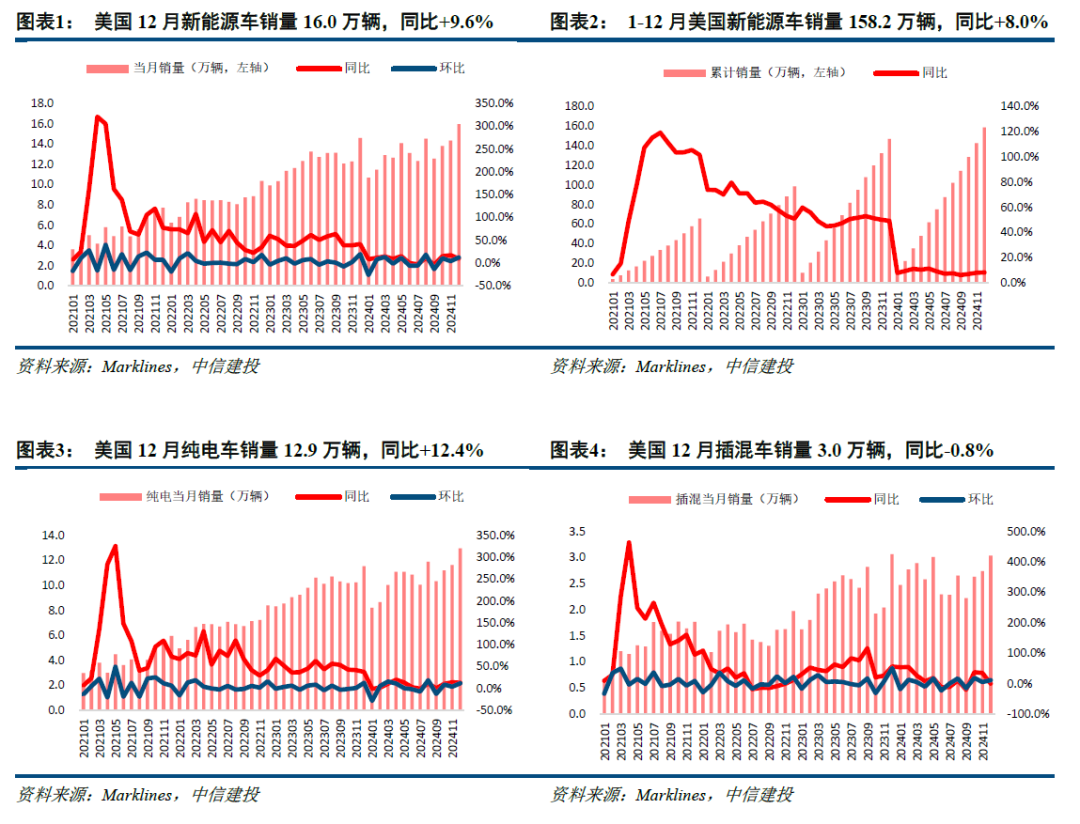 2024年美国新能源汽车累计销量158.2万辆,累计同比+8.0%,渗透率9.6%,累计同比+0.53pct。其中纯电销量126.6万辆,同比+7.0%,插混销量31.6万辆,同比+12.3%。其中12月美国新能源汽车销量16.0万辆,同比+9.6%,环比+11.5%,渗透率10.5%,环比+0.21pct,年底为传统销量旺季,受益于产品阵容改善、年终促销活动以及因库存增加而扩大折扣力度等积极因素推动,销量环比高增。