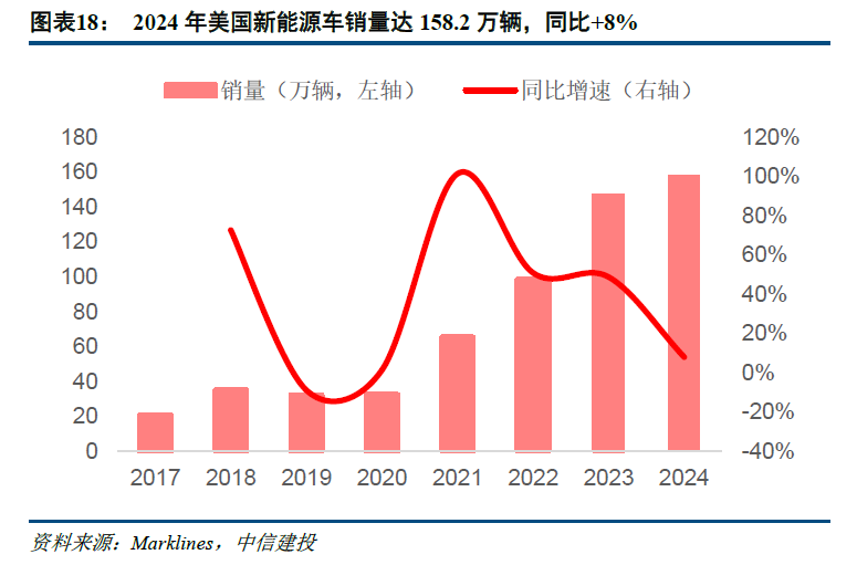 2024年美国新能源汽车累计销量158.2万辆,同比+8.0%,渗透率9.6%,同比+0.53pct,不及年初时预期,主要系:①特斯拉销量60.4万辆,受制于没有新车型刺激,同比-10%,负增长拖累增速;②2024年起电池组件FEOC细则开始生效,年初共计10个/25款车型补贴下降,对销量有短期负面影响;③2024年美国新上市的新能源车型共23款,新上市车型总销量12.3万辆,占总销量仅7.8%,相较国内每年新车型数量百款、销量占比20%-30%,美国新车型贡献相对有限。展望2025年,特朗普上台对后续补贴政策造成较大不确定性,暂不宜给太高预期。