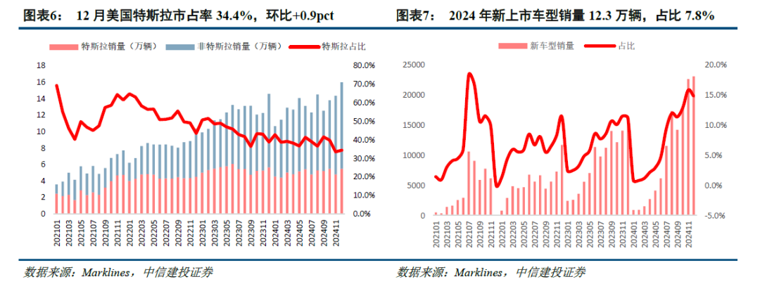 1)特斯拉负增长拖累增速。2024年特斯拉在美销量60.4万辆,同比-10%,受制于没有新车型刺激,市占率由年初的46%下降至38%;剔除特斯拉后其余车型销量97.8万辆,同比+20%,显著好于特斯拉;