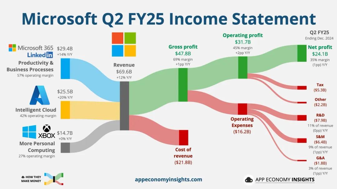 具体来看,微软2024四季报(即2025财年Q2)主要财务数据如下: