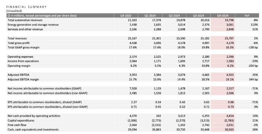 伴随着销量的下滑,特斯拉汽车业务的总营收和利润率也受到牵连。2024年第四季度,特斯拉汽车业务营收同比下降8%至198亿美元。