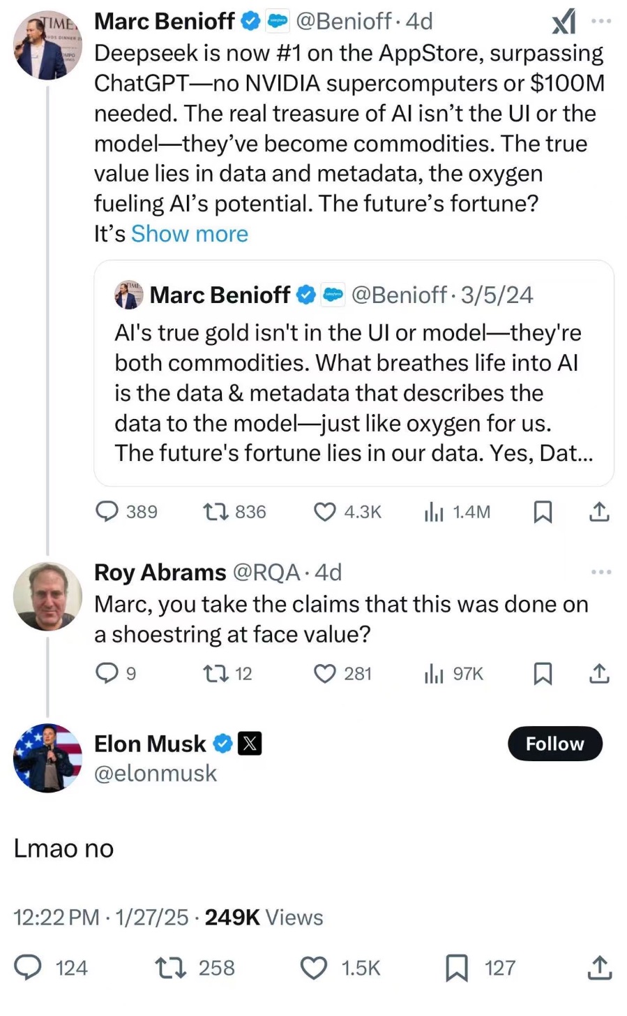 在DeepSeek评论区高速冲浪的马斯克嗅到了一丝危机,但也尝到了甜头。
