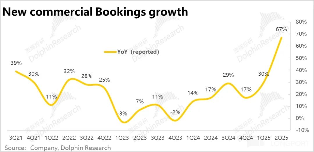 但是与Azure近期不佳的表现和指引透露出的信号完全不同,业绩的领先指标反映出的却是相当乐观的信号。首先,新签企业合同金额增速本季同比大涨了67%,是历史数据以来的最高值。