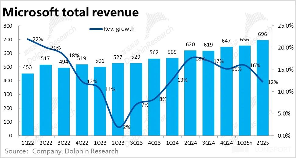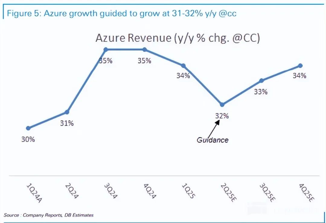 但现实是除了当季表现没有惊喜且跑输买方预期,更大的问题是Azure下季度增速的指引区间依旧是31%~32%和上季度区间完全相同,并没有提速。如果说仅是本季增速稍低于预期,市场仍可自我安慰 “下季度会好起来”,但同样不及预期的指引,则意味 “下半财年Azure增长会提速” 这个预期的并非想象中的 “大概率事件”。(以德银为例,业绩前其对3Q和4Q的Azure增速预期分别是33%和34%,逐步走高)。并促使市场下调对FY25全年乃至更长期内Azure的增长预期。
