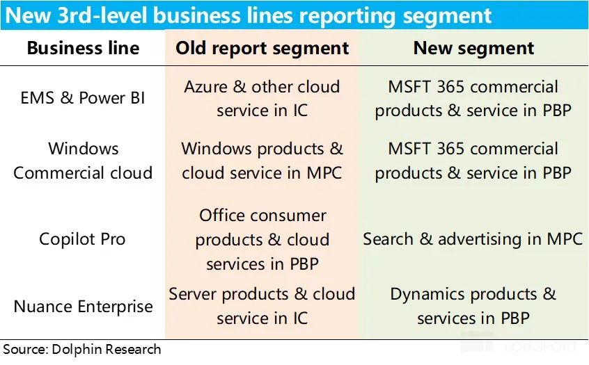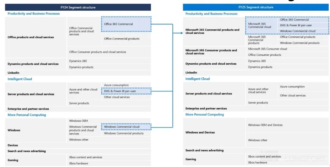 上季度财报后,微软官宣了将在25财年开始对财报披露的部门结构做出不小的调整,调整的思路就是把面向企业的微软365服务项目(除toB的office 365之外,还有windows 365和网络安全365)全部调到了以Office 365的生产力与流程的收入大项当中(PBP)。在上次业绩点评中,我们已有解读,就不再重复浪费笔墨。下图简要概括了此次的调整,供大家参考。