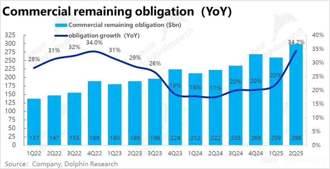 类似的,待履约企业合同余额本季也环比大增了约$390亿,达到$2980亿,同比增长34%,同样创疫情以来的最高值。据公司在报告中的披露,新增订单金额的暴涨,主要贡献是来自OpenAI的大额订单。