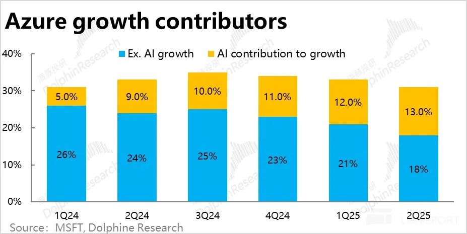 2.本季度Azure31%的增长中,约13pct是来自AI相关业务,贡献比例相比上季继续小幅上升1pct,符合市场的预期。但传统非AI业务的增长贡献则大幅下降了3pct,连续3个季度下跌且幅度在扩大,可见非AI业务的疲软是Azure整体表现不佳的元凶。