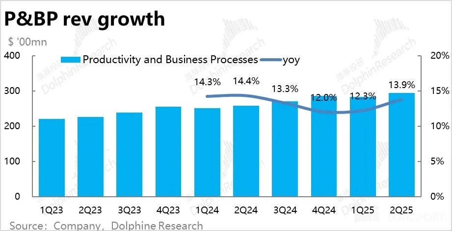 整体上,如前文所述,由于包括企业M365在内的各主要业务的增速都有所提升,本季度生产力流程板块整体收入$294亿,明显高于市场预期的$285亿。收入增速也从上季的12%提升到13.9%。该板块的增长拐点,可能标志着AI的利好已从上游硬件逐步落地到了终端的应用层面上。