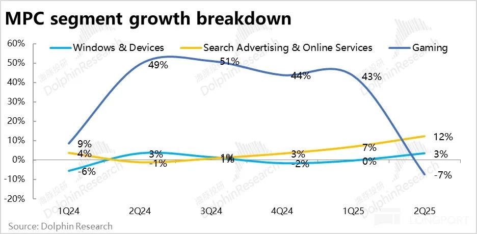 具体来看:1.并表影响消退后的游戏业务增速从先前的40%以上,回落到了-7%,游戏业务仍然面临着不小的困难;2.Windows和相关硬件设备合计收入增长3%,较先前稍有改善。但能否实质性脱离低个位数增长,仍需AI PC概念能否带动个人电脑需求的显著改善。