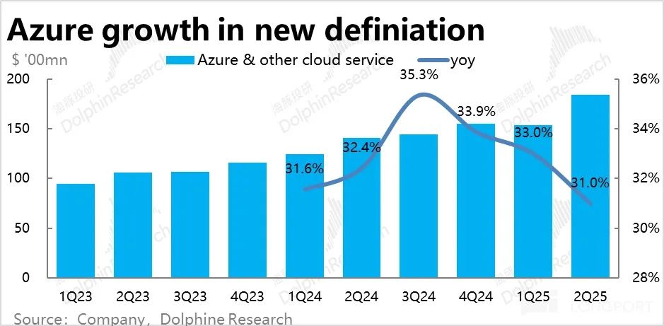 1.Azure 再提速预期幻灭:Azure在新口径下本季的同比和恒定汇率下增速都为31%。较上季度环比下降2pct。虽然位于公司先前指引31%~32%的增速区间的下限,看起来勉强达标。但由于市场在业绩前普遍相信Azure在25财年下半年会结束持续3个Q的增长放缓,重新加速,买方实际对Azure的本季增速预期至少是32%,下个季度则希望进一步提速到33%~34%。