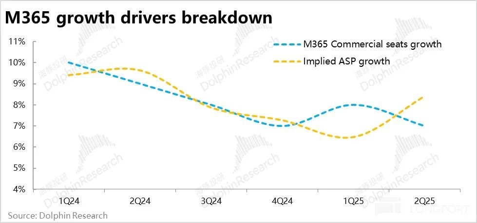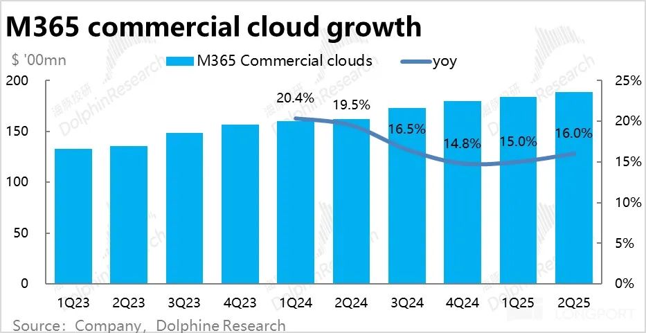 与AI紧密度第二高,且口径调整后营收体量占公司整体同样前二的企业微软365业务(Microsoft 365 commercial)本季收入增长16%(恒定汇率下增长15%),较上季度小幅提速1pct。相比公司先前指引不变汇率下14%的增速也高出1pct。