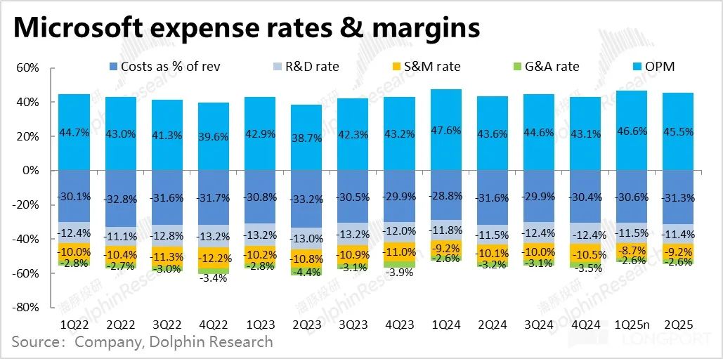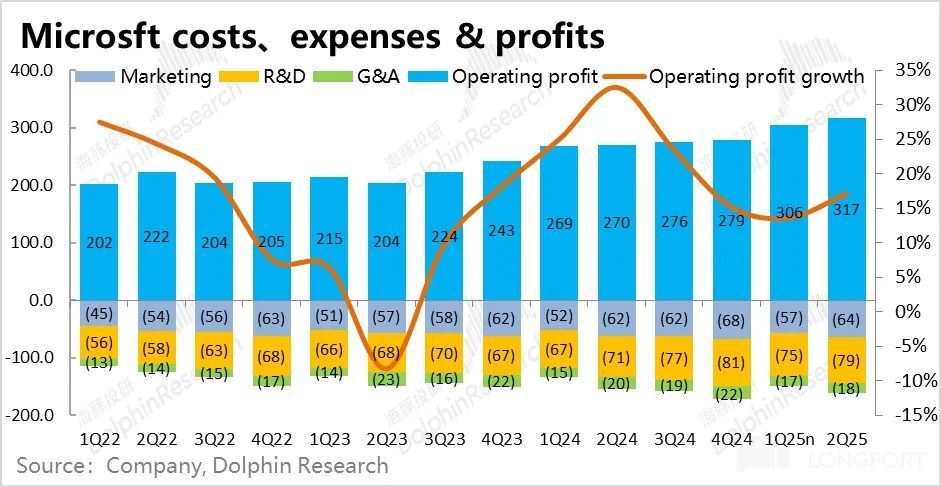 2.费用角度,微软本季的营销、研发和管理费用三费合计同比增长仅5%,明显低于12%的营收增速,因此三费费率同比减少了1.6pct。具体来看,研发费用同比增长11%,和收入增速基本同频,在研发上的投入并不吝啬。但营销费用和管理费用则分别同比增长了3%和-8%。或是出于AI带来的降本增效,或是公司出于对冲AI大量capex投入,主动控制费用的角度,总之微软通过在营销和管理费用上的控制,继续挤出了一些增量利润。