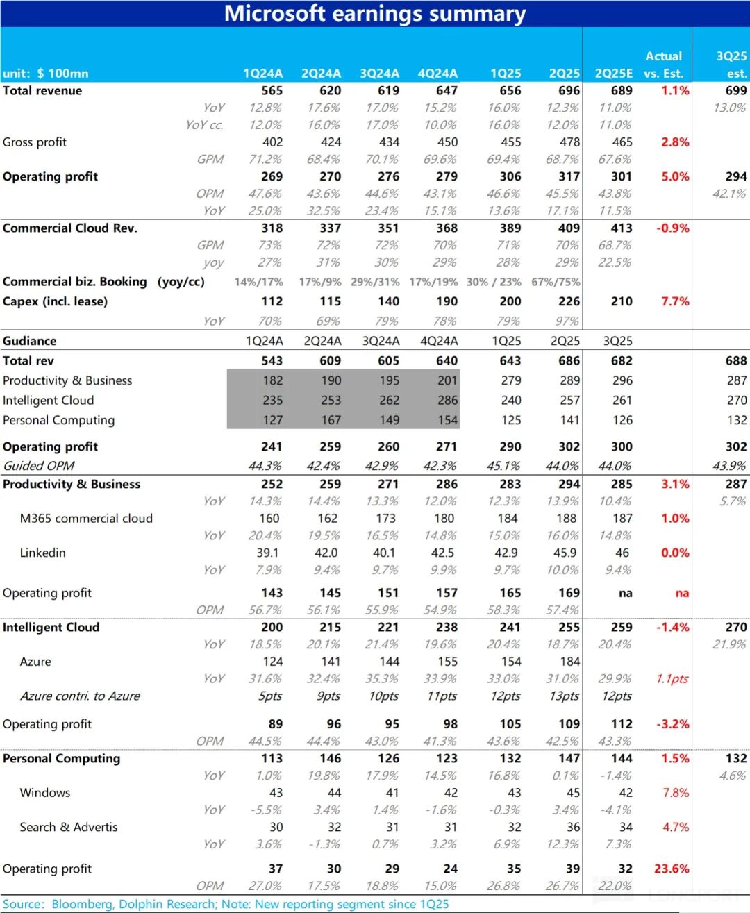 费用角度,除了研发费用大体和营收增长同频,不算吝啬外,营销费用和管理费用分仅别同比增长了3%和-8%,明显低于营收增速。无论是出于AI带来的增效,或是公司出于对冲AI大量capex投入的需求,主动裁员&控费的选择,结果是通过在营销和管理费用上的管控,挤出了约1.6pct的额外经营利润率。使得本季度微软整体经营利润$317亿,高出预期的301亿约5%。