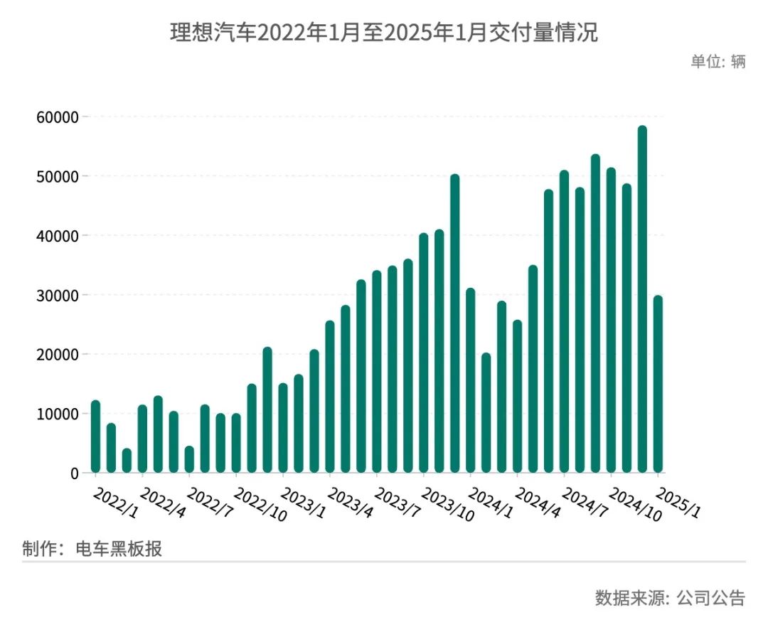 根据理想汽车2月1日发布的2025年1月交付数据,公司当月交付量为2.99万辆,同比、环比分别下滑3.97%和48.85%,是五家上市新势力中唯一同比环比双降的车企。