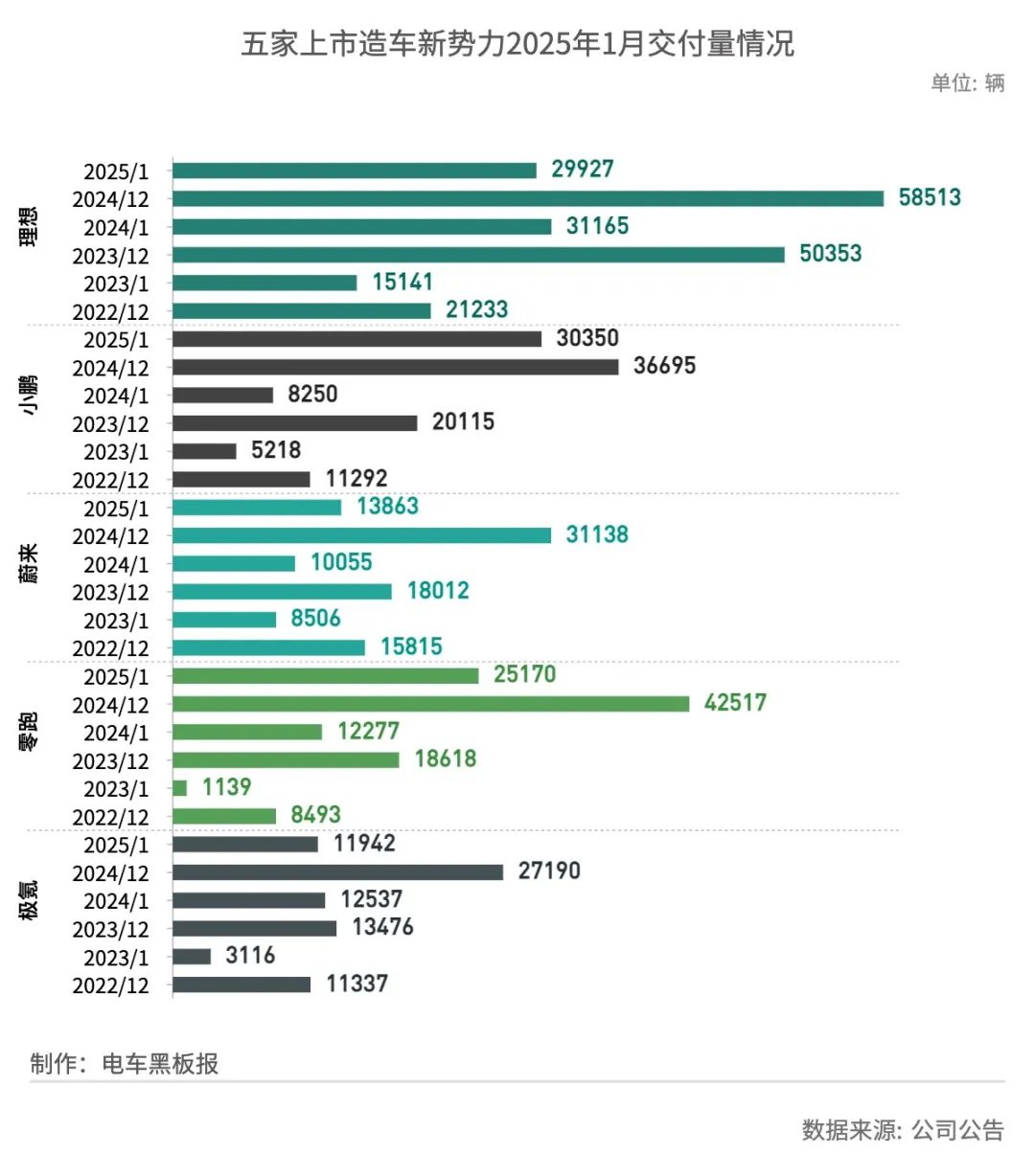 1月,小鹏、零跑、蔚来、极氪四家车企的交付量分别环比下滑17.29%、40.8%、55.48%和56.08%。