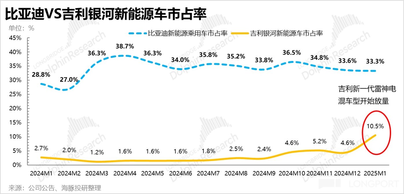 但同行如吉利,在 2024 年下半年就开始发布此类技术,2024 年末就开始了大规模量产(银河星舰 7 EMI),成功打造出爆款车型,比亚迪混动技术的代差先发优势已经被同行基本追平,而比亚迪 2024 年 12 月和 2025 年 1 月销量都不及市场预期,市占率呈现下滑趋势,比亚迪迫切需要新车型的大幅度升级来实现市场份额的防守和进一步扩张。