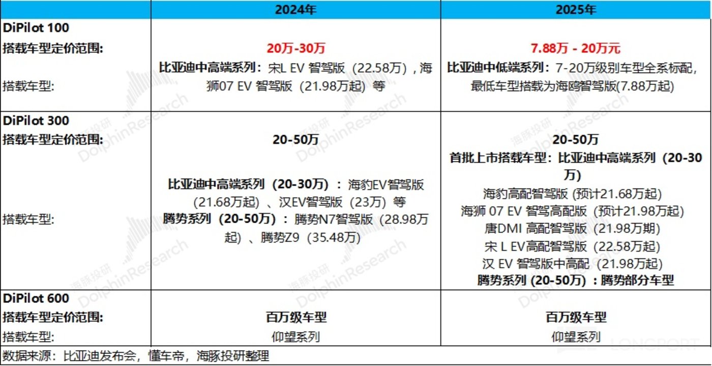 同时从比亚迪智驾三种配置对比于 2024 年搭载车型价格带的边际变化来看,中高端智驾版本(Dipilot300/Dipilot 600)搭载车型价格带基本相比 2024 年无变化;而真正智驾价格带下沉最大的是中低端智驾版本 (Dipilot 100),搭载车型定价范围从 2024 年 20-30 万元下沉到 2025 年 7 万级-20 万元,也正是比亚迪销量的基本盘上,低价车型的 “智驾下沉” 将成为比亚迪 2025 年最大增量。