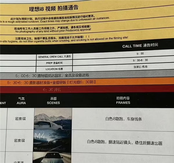 根据曝光的拍摄通告推测,理想i8的宣发材料筹备工作已经开始,拍摄 周期 预计为15至30天。这意味着该车最早可能在4月开始预热,并有望在上海车展(4月23日至5月2日)正式亮相。